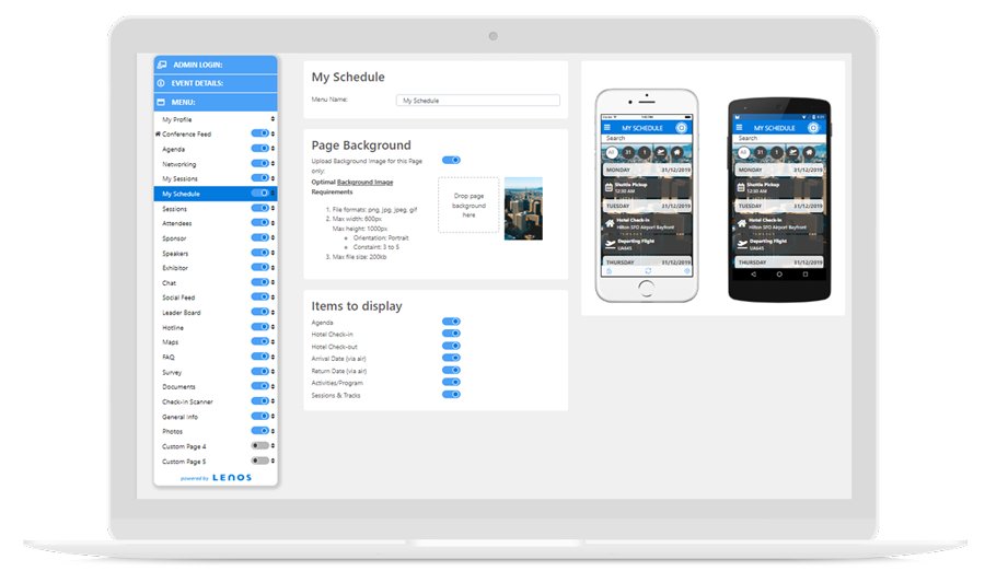 Once you create your program event website in Lenos Studio, virtual, in-person or hybrid, a simple one click automatically generates your native mobile app!